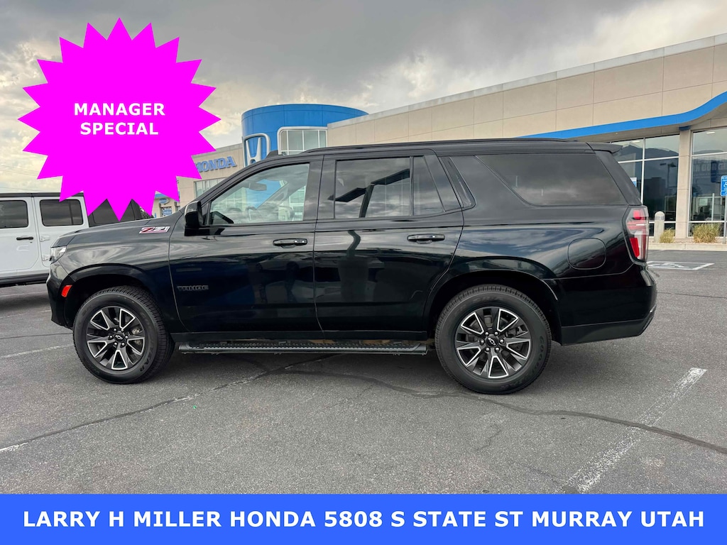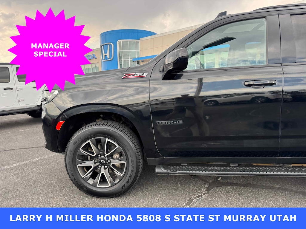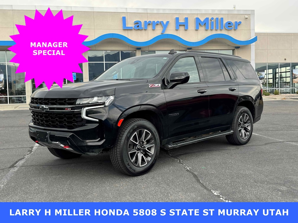 Larry H. Miller Honda Murray offers this 2021 Black Chevrolet Tahoe Z71 4WD It is loaded with many standard and optional features including: License Plate Front Mounting Package, Preferred Equipment Group 2Z7 (1st & 2nd Row Color-Keyed Carpeted Floor Mats, 2 USB Data Ports, 2-Speed Active Electronic AutoTrac Transfer Case, Auto-Dimming Inside Rear-View Mirror, Black Tubular Assist Steps, Bright Front & Rear Door Sill Plates, Color-Keyed Carpeting Floor Covering, Driver & Front Outboard Passenger Airbags, Floor Console w/Storage Area, Front High-Approach Angle Fascia, Hands-Free Rear Power Programmable Liftgate, HD Radio, Hill Descent Control, Infotainment Display, Leather-Wrapped Steering Wheel, LED Daytime Running Lamps, Memory Settings for Driver, Red Horizontal-Mounted Recovery Hooks, Remote Start, SiriusXM Radio w/360L, and Universal Home Remote), 4WD, Black Leather, 10-Way Power Driver & Passenger Seat Adjusters, 3.23 Rear Axle Ratio, 3rd row seats: split-bench, 4-Wheel Disc Brakes, 9 Speakers, ABS brakes, Air Conditioning, Alloy wheels, AM/FM radio: SiriusXM with 360L, Apple CarPlay/Android Auto, Auto High-beam Headlights, Auto-dimming Rear-View mirror, Automatic temperature control, Bose 9-Speaker Stereo Audio System Feature, Brake assist, Bumpers: body-color, Compass, Delay-off headlights, Driver door bin, Driver vanity mirror, Dual front impact airbags, Dual front side impact airbags, Dual-Pane Power Panoramic Sunroof, Electronic Stability Control, Emergency communication system: OnStar and Chevrolet connected services capable, Four wheel independent suspension, Front anti-roll bar, Front Bucket Seats, Front Center Armrest, Front dual zone A/C, Front High-Back Reclining Bucket Seats, Front reading lights, Fully automatic headlights, Garage door transmitter, Heated door mirrors, Heated Driver & Front Passenger Seats, Heated front seats, Illuminated entry, Leather Seat Trim, Leather steering wheel, Low tire pressure warning, Memory seat, Occupant sensing airbag, Outside temperature display, Overhead airbag, Overhead console, Panic alarm, Passenger door bin, Passenger vanity mirror, Power door mirrors, Power driver seat, Power Liftgate, Power passenger seat, Power steering, Power windows, Premium audio system: Chevrolet Infotainment 3, Premium Smooth Ride Suspension, Radio: Chevrolet Infotainment 3 Plus System, Rain sensing wipers, Rear air conditioning, Rear anti-roll bar, Rear reading lights, Rear seat center armrest, Rear window defroster, Rear window wiper, Remote keyless entry, Roof rack: rails only, Security system, Speed control, Speed-sensing steering, Split folding rear seat, Spoiler, Steering wheel mounted audio controls, Tachometer, Telescoping steering wheel, Tilt steering wheel, Traction control, Trip computer, Variably intermittent wipers, Voltmeter, and Wheels: 20 x 9 Machined Aluminum.