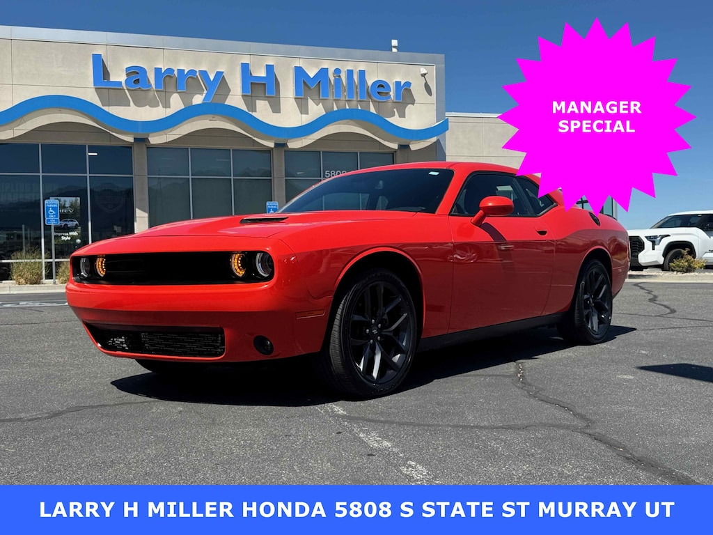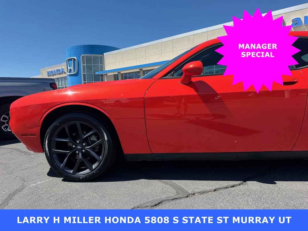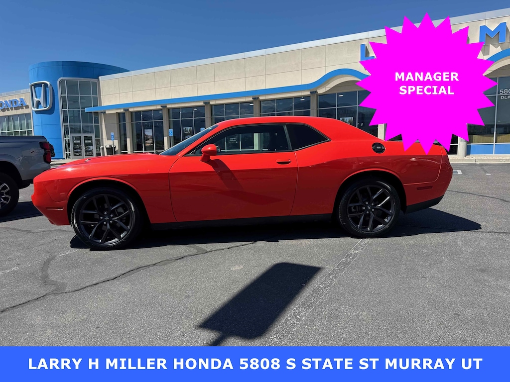 Larry H. Miller Honda Murray offers this 2021 Go Mango Dodge Challenger SE RWD It is loaded with many standard and optional features including: Blacktop Package (Black Fuel Filler Door, Black Grille w/Bezel, Challenger Blacktop Grille Badge, Gloss Black I/P Cluster Trim Rings, Leather Performance Steering Wheel, Rear Black Spoiler, Satin Black Dodge Tail Lamp Badge, and Wheels: 20 x 8.0 Black Noise Painted), Quick Order Package 2EA, 4-Wheel Disc Brakes, 6 Speakers, ABS brakes, Air Conditioning, Alloy wheels, AM/FM radio, Anti-whiplash front head restraints, Apple CarPlay, Apple CarPlay/Android Auto, Auto-dimming Rear-View mirror, Automatic temperature control, Brake assist, Bumpers: body-color, Compass, Delay-off headlights, Driver door bin, Driver vanity mirror, Dual front impact airbags, Dual front side impact airbags, Electronic Stability Control, For More Info, Call 800-643-2112, Four wheel independent suspension, Front anti-roll bar, Front Bucket Seats, Front Center Armrest, Front dual zone A/C, Front License Plate Bracket, Front reading lights, Fully automatic headlights, Google Android Auto, GPS Antenna Input, Heated door mirrors, Houndstooth Cloth Sport Seat, Illuminated entry, Integrated Center Stack Radio, Integrated Voice Command w/Bluetooth, Leather Shift Knob, Low tire pressure warning, Media Hub (2 USB, AUX), Outside temperature display, Overhead airbag, Overhead console, Panic alarm, ParkView Rear Back-Up Camera, Passenger door bin, Passenger vanity mirror, Power door mirrors, Power driver seat, Power steering, Power windows, Radio data system, Radio: Uconnect 4 w/7 Display, Rear anti-roll bar, Rear reading lights, Rear seat center armrest, Rear window defroster, Remote keyless entry, Security system, SiriusXM Radio Service, SiriusXM Satellite Radio, Speed control, Speed-sensing steering, Split folding rear seat, Spoiler, Steering wheel mounted audio controls, Tachometer, Telescoping steering wheel, Tilt steering wheel, Traction control, Trip computer, USB Host Flip, Variably intermittent wipers, and Wheels: 18 x 7.5 Cast Aluminum.