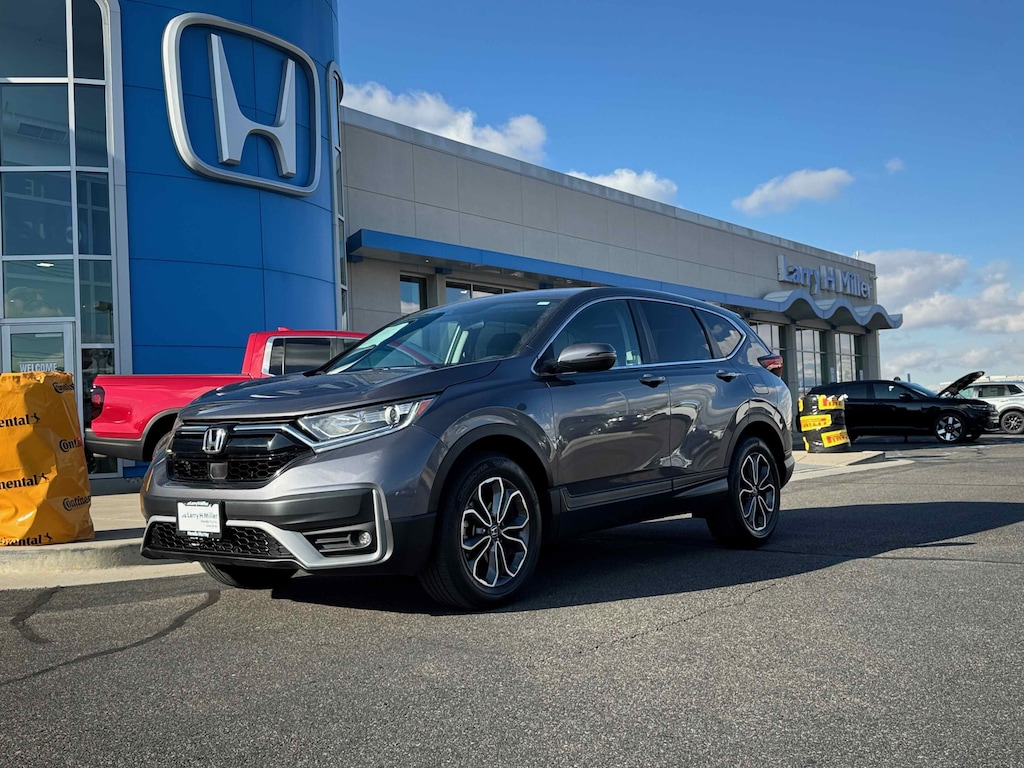 Larry H. Miller Honda Murray offers this 2021 Sonic Gray Pearl Honda CR-V EX AWD It is loaded with many standard and optional features including: AWD, 18 Alloy Wheels, 4-Wheel Disc Brakes, 5.64 Axle Ratio, 6 Speakers, ABS brakes, Adaptive Cruise Control: Adaptive Cruise Control (ACC) with Low-Speed Follow, Air Conditioning, Alloy wheels, AM/FM radio: SiriusXM, Apple CarPlay/Android Auto, Auto High-beam Headlights, Automatic temperature control, Blind Spot Information (BSI) System warning, Brake assist, Bumpers: body-color, Cloth Seat Trim, Compass, Delay-off headlights, Driver door bin, Driver vanity mirror, Dual front impact airbags, Dual front side impact airbags, Electronic Stability Control, Exterior Parking Camera Rear, Forward collision: Collision Mitigation Braking System (CMBS) + FCW mitigation, Four wheel independent suspension, Front anti-roll bar, Front Bucket Seats, Front Center Armrest, Front dual zone A/C, Front fog lights, Front reading lights, Heated door mirrors, Heated Front Bucket Seats, Heated front seats, Illuminated entry, Low tire pressure warning, Occupant sensing airbag, Outside temperature display, Overhead airbag, Overhead console, Panic alarm, Passenger door bin, Passenger vanity mirror, Power door mirrors, Power driver seat, Power moonroof, Power steering, Power windows, Radio data system, Radio: 180-Watt AM/FM/HD/SiriusXM Audio System, Rear anti-roll bar, Rear seat center armrest, Rear window defroster, Rear window wiper, Remote keyless entry, Security system, Speed control, Speed-sensing steering, Speed-Sensitive Wipers, Split folding rear seat, Spoiler, Steering wheel mounted audio controls, Tachometer, Telescoping steering wheel, Tilt steering wheel, Traction control, Trip computer, Turn signal indicator mirrors, and Variably intermittent wipers.