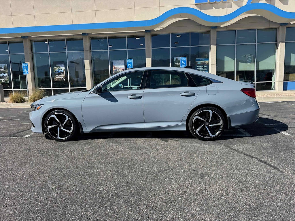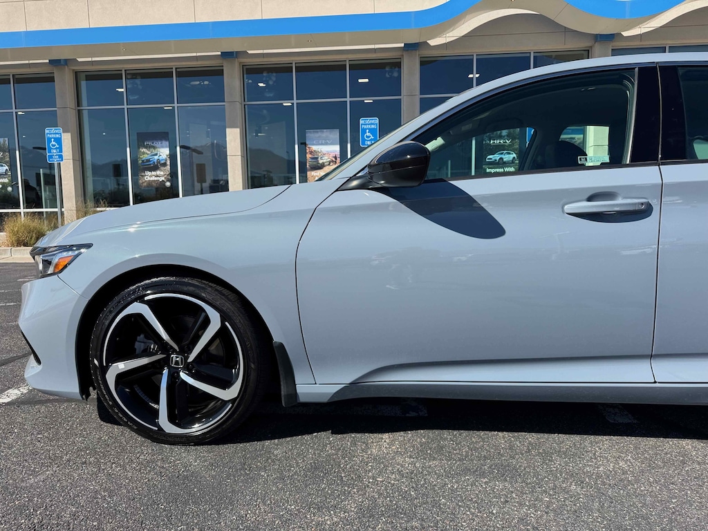 Larry H. Miller Honda Murray offers this 2022 Grey Honda Accord Sport Special Edition FWD It is loaded with many standard and optional features including: Black Leather, 4-Wheel Disc Brakes, 8 Speakers, ABS brakes, Adaptive Cruise Control: Adaptive Cruise Control (ACC) with Low-Speed Follow, Air Conditioning, Alloy wheels, AM/FM radio, Apple CarPlay/Android Auto, Auto High-beam Headlights, Automatic temperature control, Brake assist, Bumpers: body-color, Delay-off headlights, Driver door bin, Driver vanity mirror, Dual front impact airbags, Dual front side impact airbags, Electronic Stability Control, Emergency communication system: HondaLink, Exterior Parking Camera Rear, Forward collision: Collision Mitigation Braking System (CMBS) + FCW mitigation, Four wheel independent suspension, Front anti-roll bar, Front Bucket Seats, Front Center Armrest, Front dual zone A/C, Front fog lights, Front reading lights, Fully automatic headlights, Heated door mirrors, Heated Front Bucket Seats, Heated front seats, Illuminated entry, Knee airbag, Lane Departure Warning System, Leather Shift Knob, Leather steering wheel, Low tire pressure warning, Occupant sensing airbag, Outside temperature display, Overhead airbag, Overhead console, Panic alarm, Passenger door bin, Passenger vanity mirror, Perforated Leather Seat Trim, Power door mirrors, Power driver seat, Power passenger seat, Power steering, Power windows, Radio data system, Radio: 180-Watt AM/FM Audio System, Rear anti-roll bar, Rear seat center armrest, Rear window defroster, Remote keyless entry, Security system, Speed control, Speed-sensing steering, Speed-Sensitive Wipers, Split folding rear seat, Spoiler, Steering wheel mounted audio controls, Tachometer, Telescoping steering wheel, Tilt steering wheel, Traction control, Trip computer, Variably intermittent wipers, and Wheels: 19 Machine-Finished Alloy w/Black Inserts.