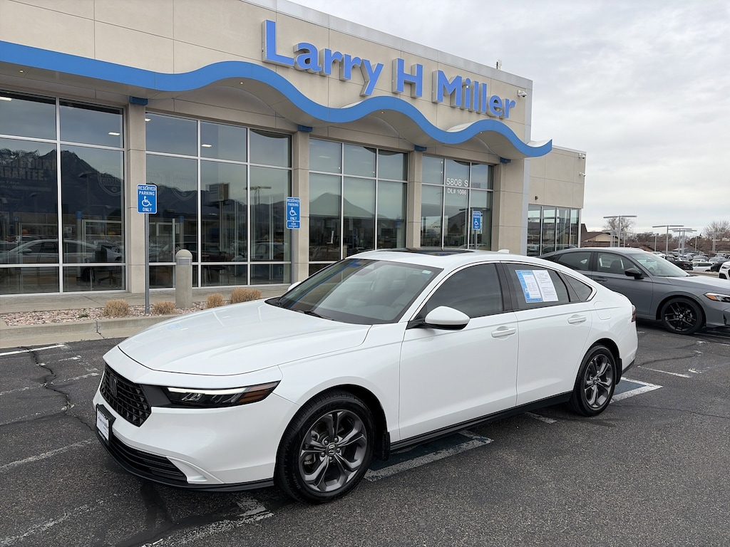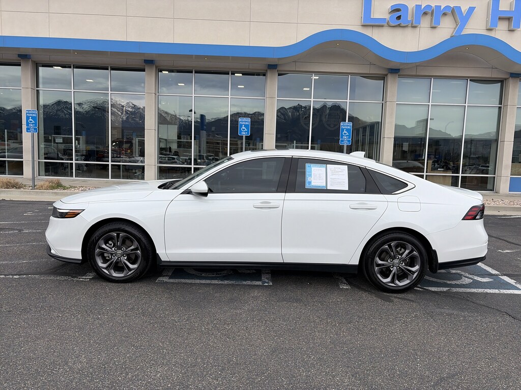 Larry H. Miller Honda Murray offers this 2023 White Honda Accord EX FWD It is loaded with many standard and optional features including: 4-Wheel Disc Brakes, 8 Speakers, ABS brakes, Adaptive Cruise Control: Adaptive Cruise Control (ACC) with Low-Speed Follow, Air Conditioning, Alloy wheels, AM/FM radio, Apple CarPlay/Android Auto, Auto High-beam Headlights, Auto-dimming Rear-View mirror, Automatic temperature control, Brake assist, Bumpers: body-color, Compass, Delay-off headlights, Driver door bin, Driver vanity mirror, Dual front impact airbags, Dual front side impact airbags, Electronic Stability Control, Emergency communication system: HondaLink Assist, Exterior Parking Camera Rear, Fabric Seat Trim, Four wheel independent suspension, Front anti-roll bar, Front Bucket Seats, Front Center Armrest, Front dual zone A/C, Front reading lights, Fully automatic headlights, Heated door mirrors, Heated Front Bucket Seats, Heated front seats, Illuminated entry, Knee airbag, Lane departure: Lane Keeping Assist System (LKAS) active, Low tire pressure warning, Occupant sensing airbag, Outside temperature display, Overhead airbag, Overhead console, Panic alarm, Passenger door bin, Passenger vanity mirror, Power door mirrors, Power driver seat, Power moonroof, Power steering, Power windows, Radio data system, Radio: 180-Watt AM/FM Audio System, Rear anti-roll bar, Rear reading lights, Rear seat center armrest, Rear side impact airbag, Rear window defroster, Remote keyless entry, Security system, Speed control, Speed-sensing steering, Speed-Sensitive Wipers, Split folding rear seat, Steering wheel mounted audio controls, Tachometer, Telescoping steering wheel, Tilt steering wheel, Traction control, Trip computer, Variably intermittent wipers, and Wheels: 17 x 7.5 Pewter Gray.