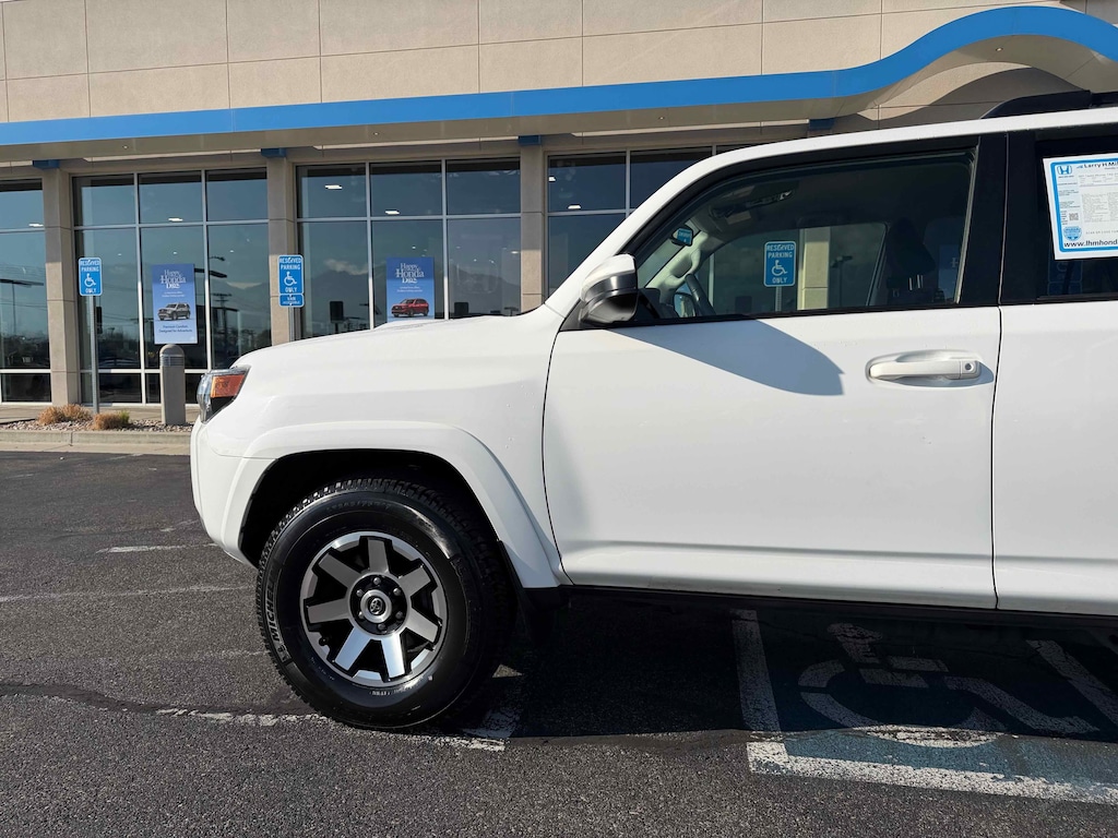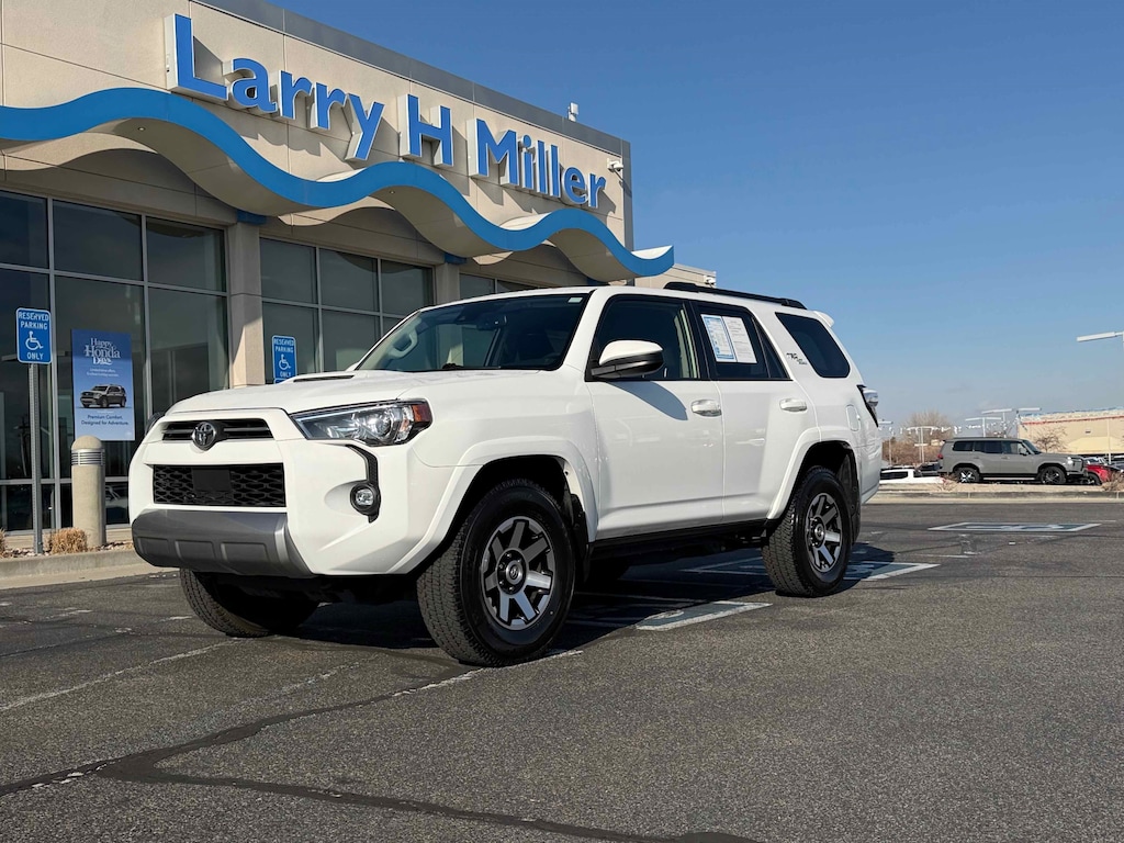 Larry H. Miller Honda Murray offers this 2021 Super White Toyota 4Runner TRD Off-Road 4WD It is loaded with many standard and optional features including: 4WD, Black/Graphite Cloth, 3.727 Axle Ratio, 4-Wheel Disc Brakes, 8 Speakers, ABS brakes, Air Conditioning, Alloy wheels, AM/FM radio: SiriusXM, Anti-whiplash front head restraints, Apple CarPlay/Android Auto, Auto High-beam Headlights, Black Roof Rails, Brake assist, Bumpers: body-color, Compass, Driver door bin, Driver vanity mirror, Dual front impact airbags, Dual front side impact airbags, Electronic Stability Control, Emergency communication system: Safety Connect with 1-year trial, Exterior Parking Camera Rear, Fabric Seat Trim, Front anti-roll bar, Front Bucket Seats, Front Center Armrest, Front fog lights, Front reading lights, Front wheel independent suspension, Heated door mirrors, Illuminated entry, Knee airbag, Leather Shift Knob, Low tire pressure warning, Occupant sensing airbag, Outside temperature display, Overhead airbag, Overhead console, Panic alarm, Passenger door bin, Passenger vanity mirror, Power door mirrors, Power driver seat, Power steering, Power windows, Radio: Audio Plus, Rear anti-roll bar, Rear seat center armrest, Rear window defroster, Rear window wiper, Remote keyless entry, Roof rack: rails only, Security system, Speed control, Speed-sensing steering, Split folding rear seat, Spoiler, Steering wheel mounted audio controls, Tachometer, Telescoping steering wheel, Tilt steering wheel, Traction control, Trip computer, Variably intermittent wipers, and Wheels: 17 x 7.5 7-Spoke Unique Off-Road Alloy.